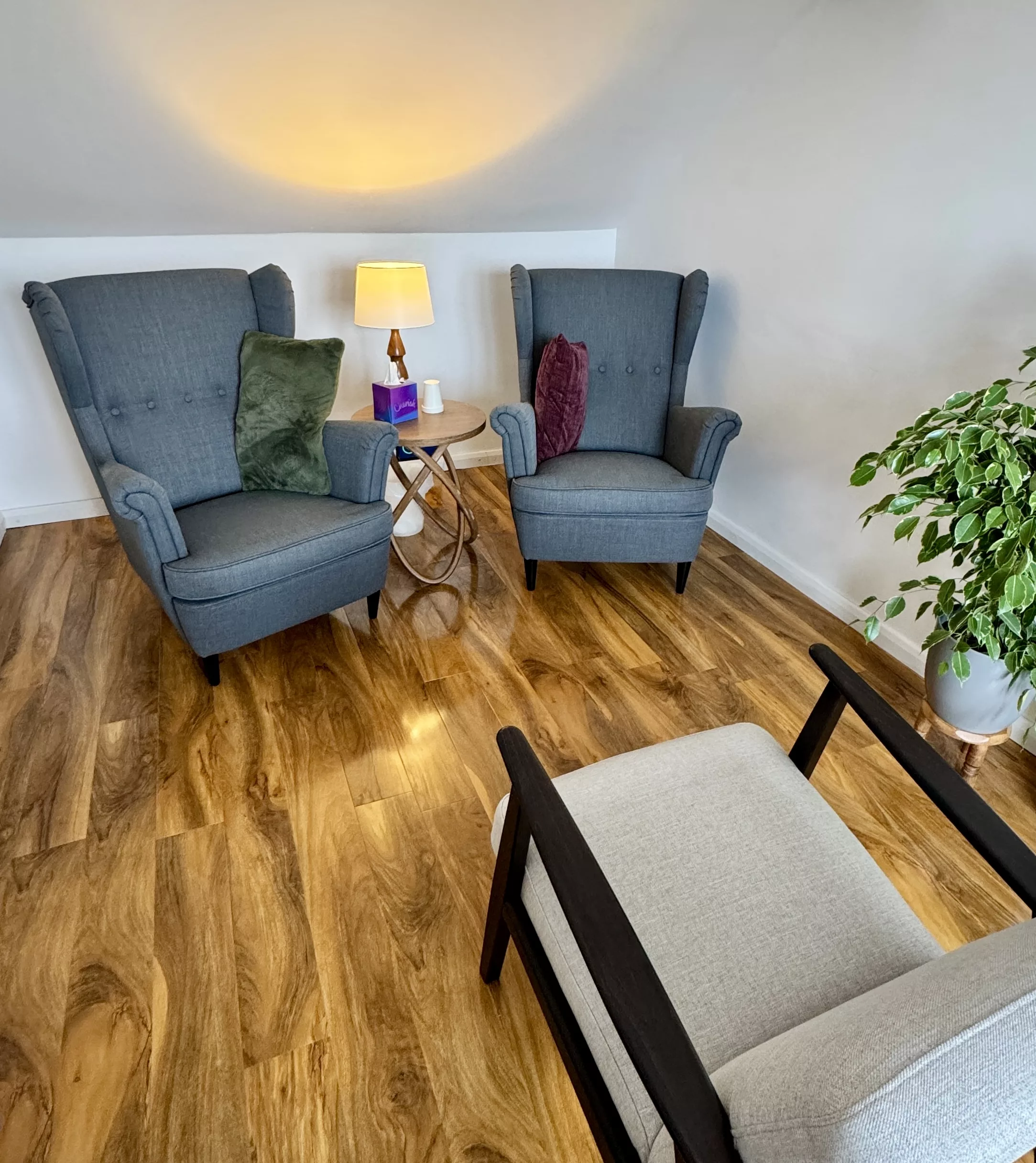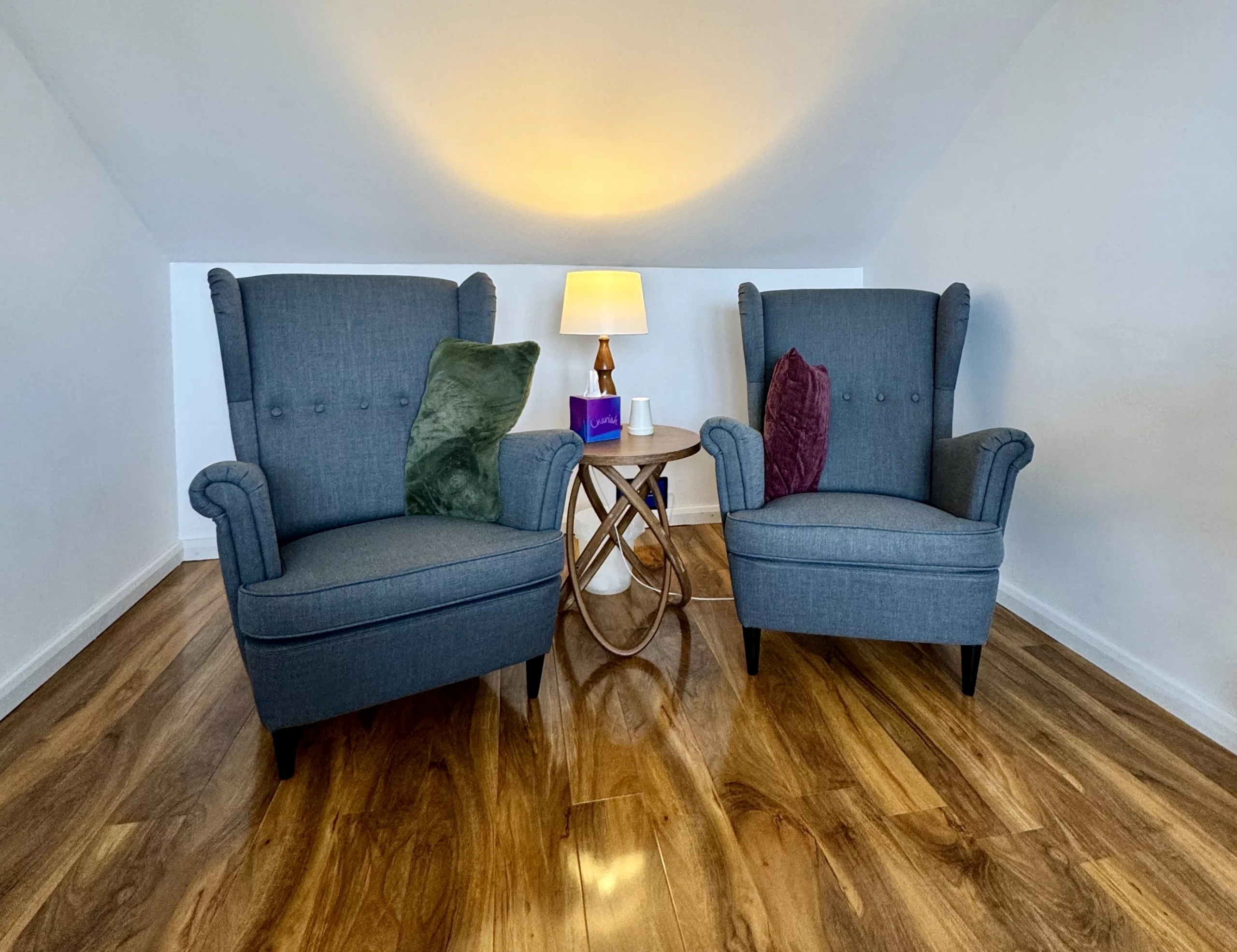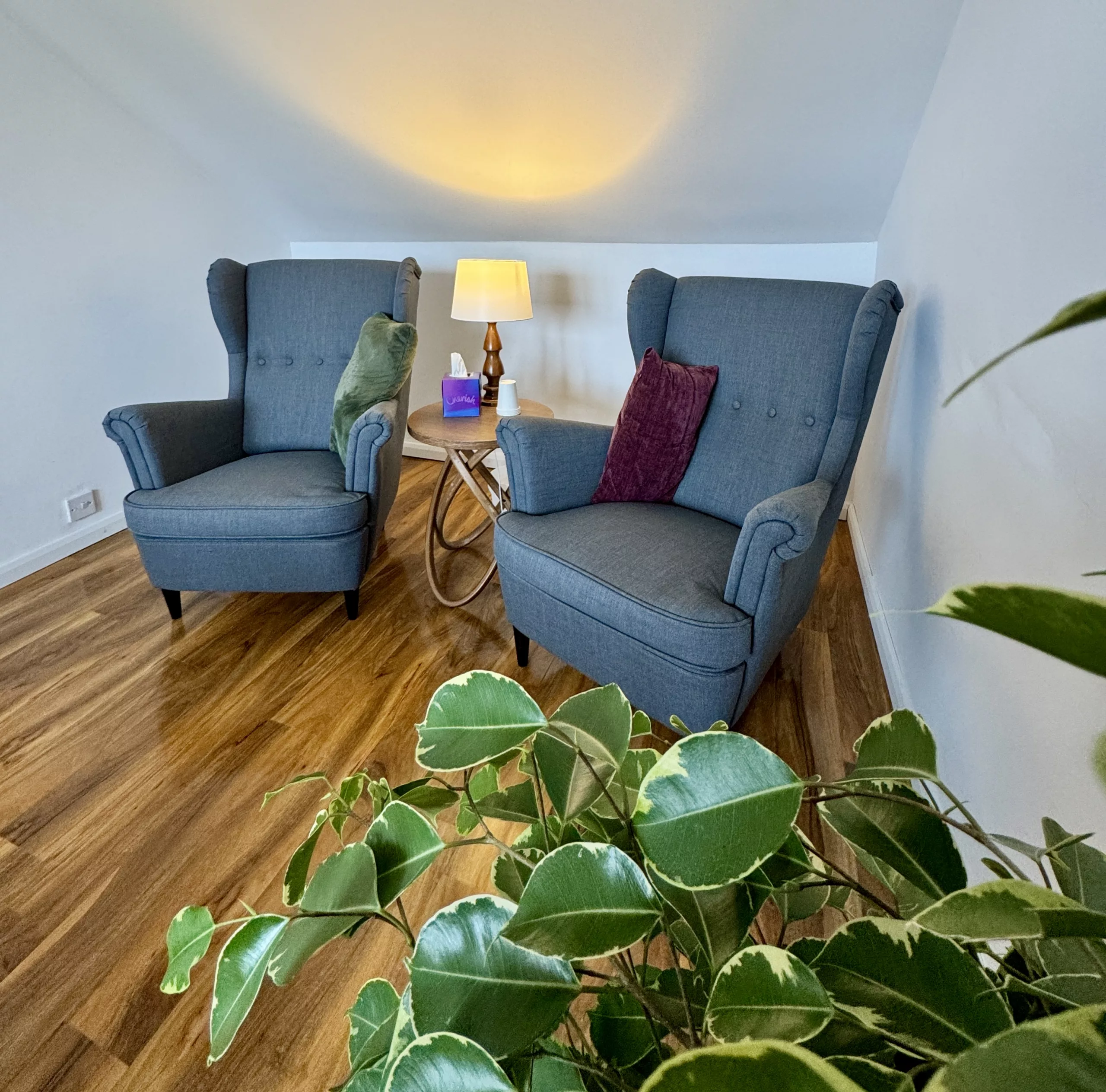 My counselling room is a private, low-sensory space designed to be calming and uncluttered. It features adjustable lighting (natural, dimmable, or soft lamps) and plants. You have a choice of seating—including comfortable armchairs or a bean bag—and can position yourself to enjoy calming views of the sky. While the room is quiet, please expect occasional suburban background noise.